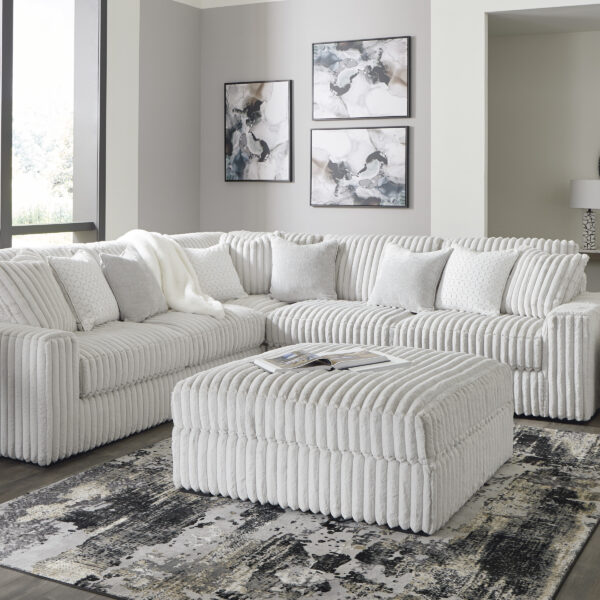 Trendika velvetkangaga Ashley Stupendous mooduldiivan 4M, mõõtudega 4368.8mm W x 3378.2mm D x 1041.4mm H.