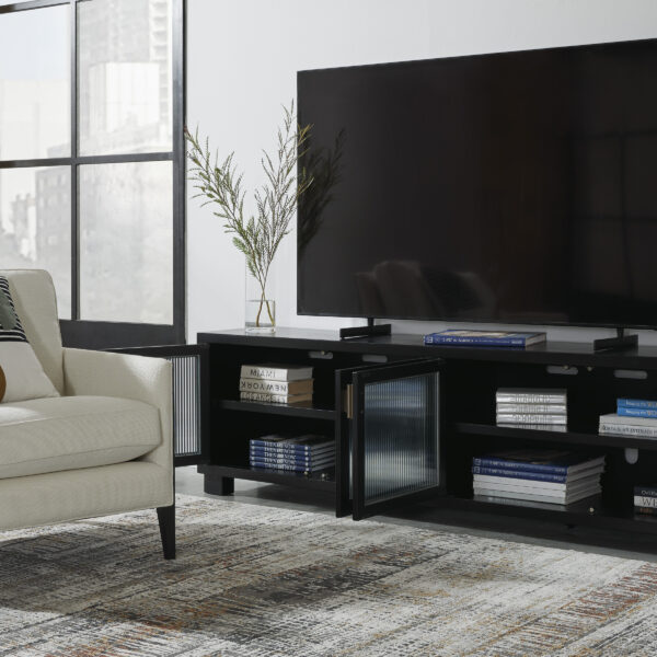 Teulat konsoollaud Blur Black kapiustel olev kergelt hägune klaas loob huvitava visuaalse efekti.