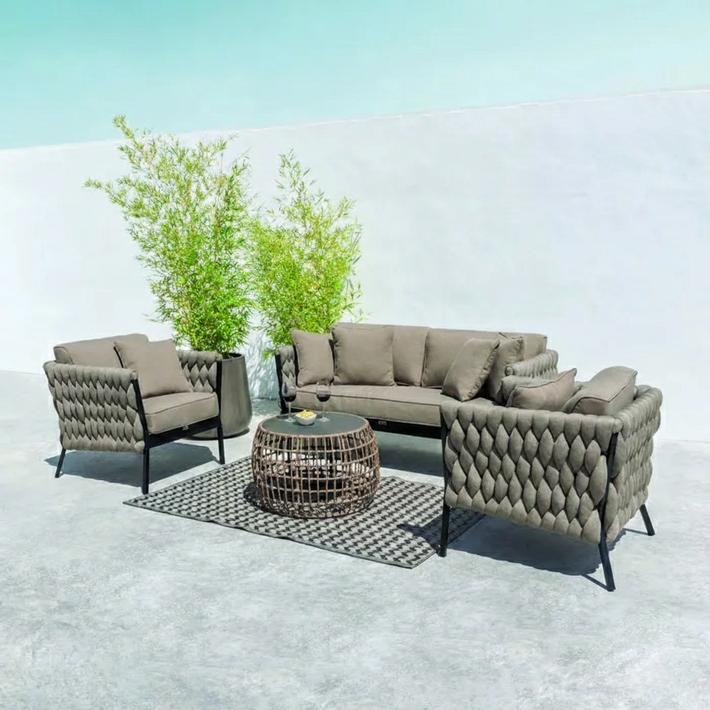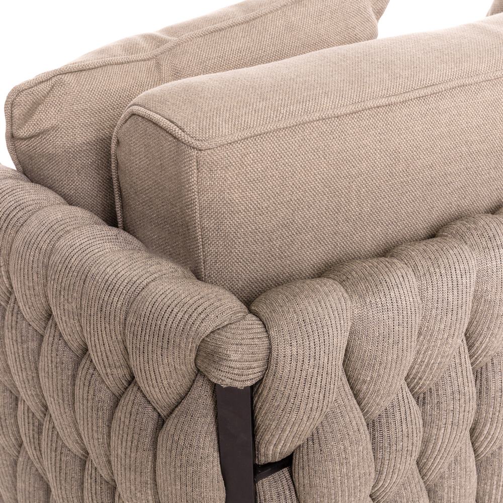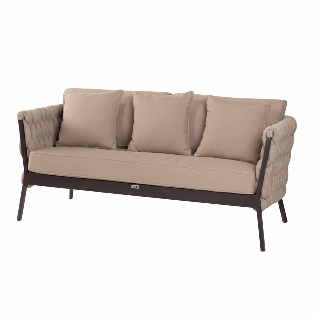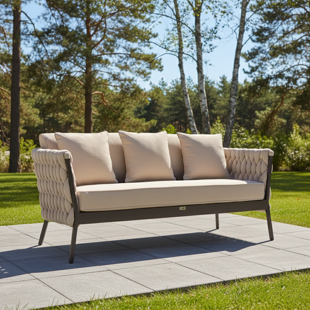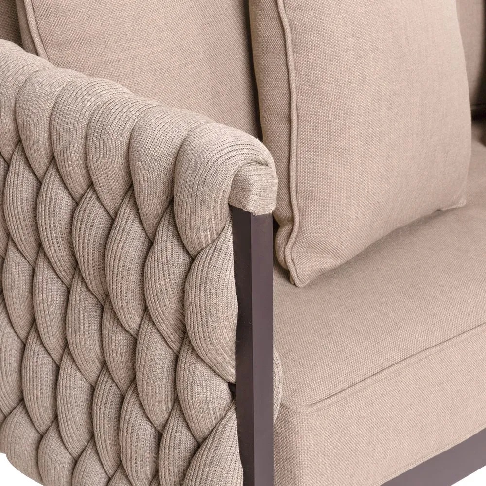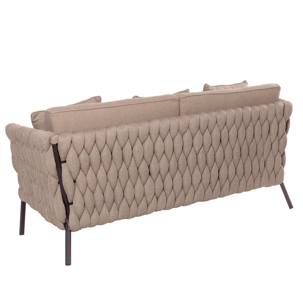 Diivan on viimistletud põimitud kangaga, mis loob visuaalset atraktiivse välimuse. Diivani konstruktsioon on valmistatud tugevast ja vastupidavast alumiiniumist. Alumiinium tagab, et mööbel peab vastu erinevatele ilmastikutingimustele, ilma kaotamata oma struktuurset terviklikkust.
