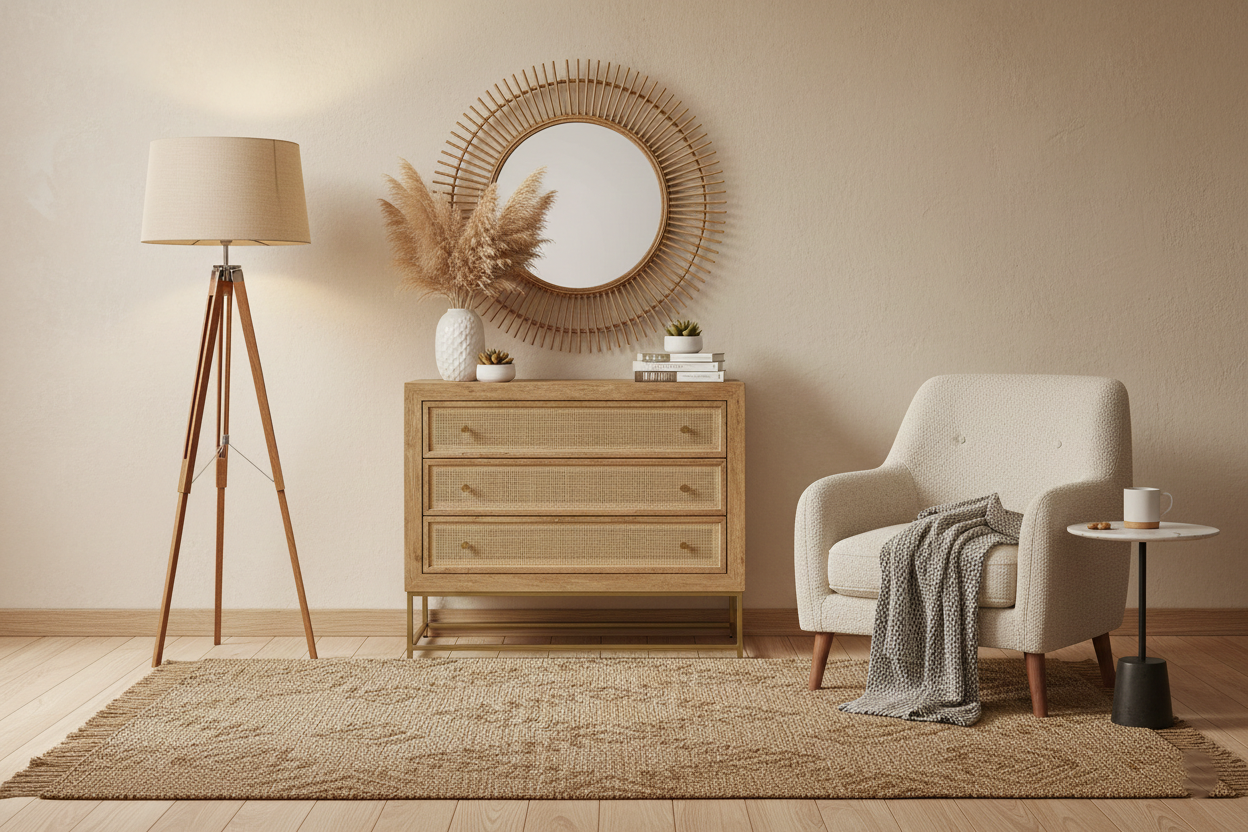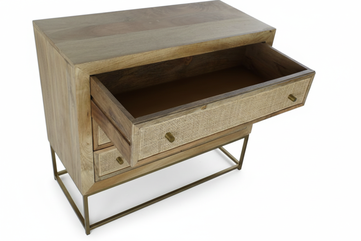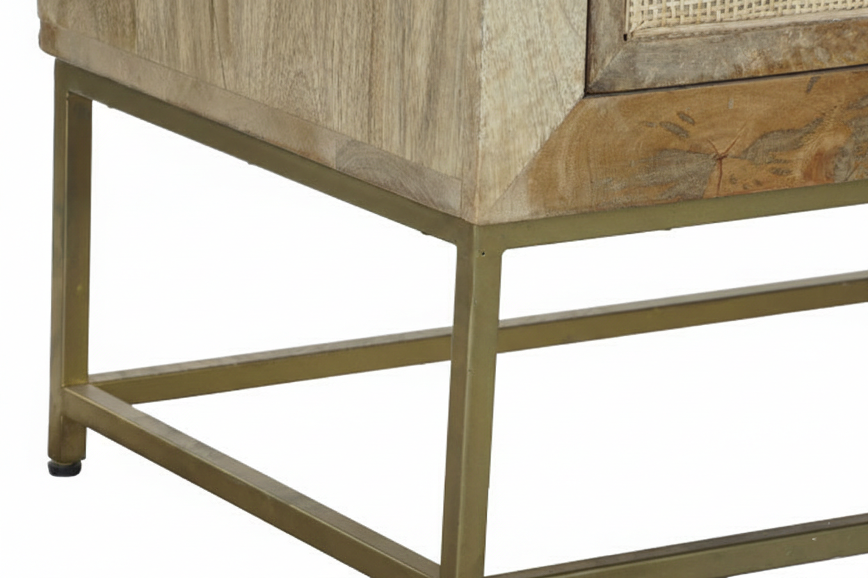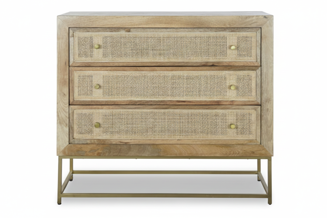 Mangopuidust ning rotangist elementidega kaunistatud kummut kiirgab modernset elegantsi, säilitades samas puidu soojust ja tekstuuri. See kombinatsioon loob harmoonilise tasakaalu, mis toob ruumi nii ilu kui ka funktsionaalsust. Kummuti viimistlus lisab stiilsust ja atraktiivsust, muutes selle tõeliselt silmapaistvaks osaks igas ruumis.