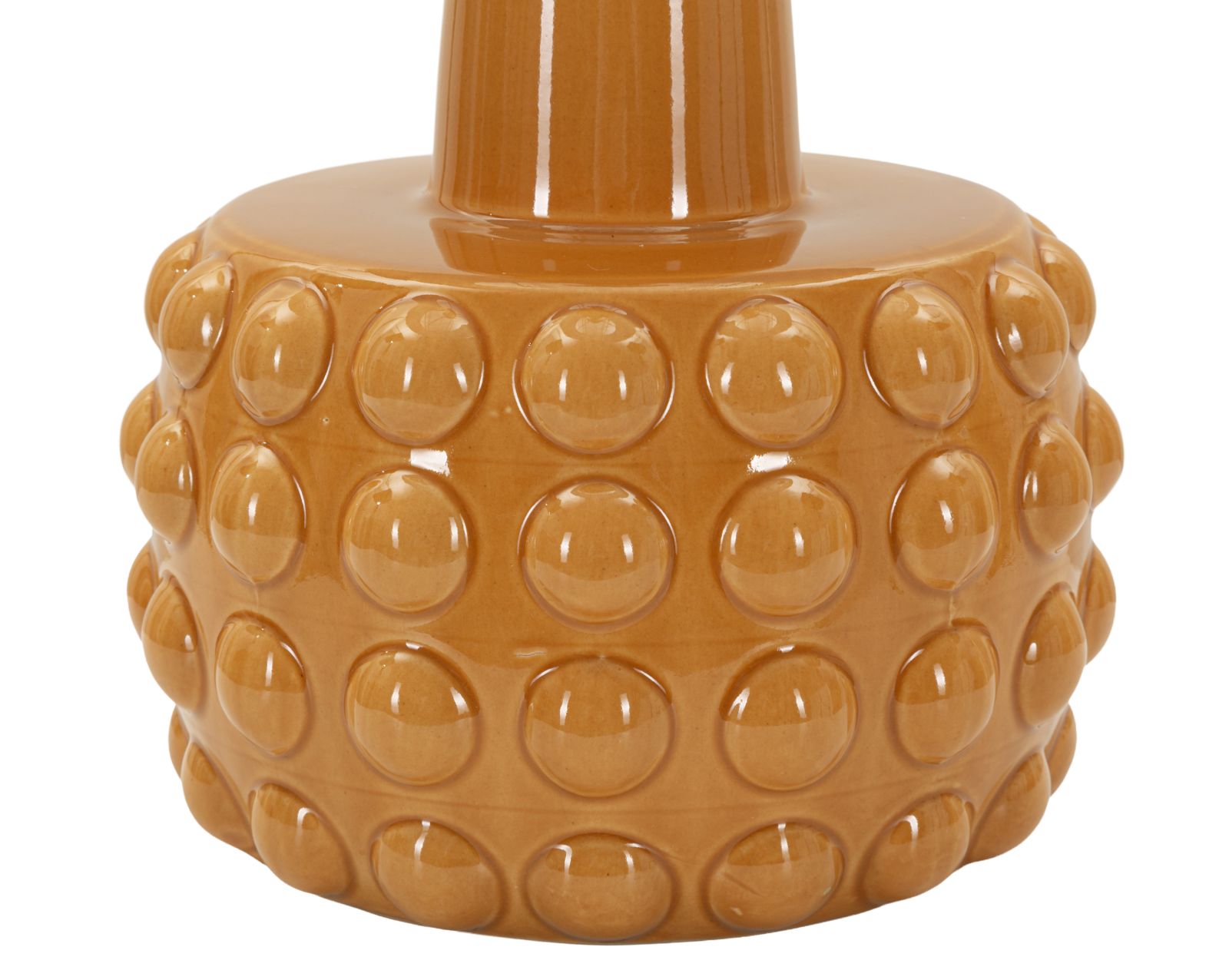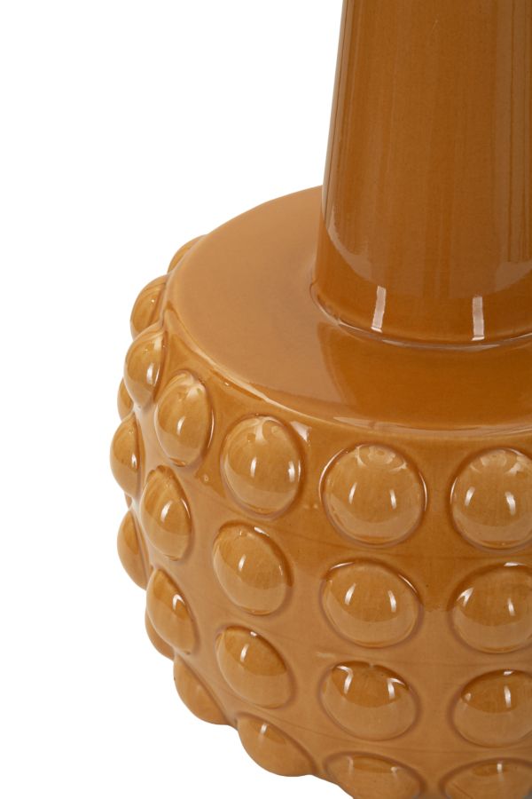 Lauavalgusti alus on oranzi tooni keraamikast, mis peegeldab valgust kaunilt ja loob ruumis sooja atmosfääri. Aluse pinnal olevad sfäärilised reljeefid lisavad tekstuuri ja sügavust, muutes iga nurga alt vaadates valgusti visuaalselt huvitavaks.