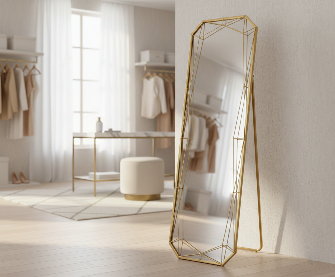 Põrandapeegel Golden on tõeline tasakaalu kehastus esteetika ja praktilisuse vahel, pakkudes igapäevast kasutusmugavust ja andes ruumile visuaalset dünaamikat.