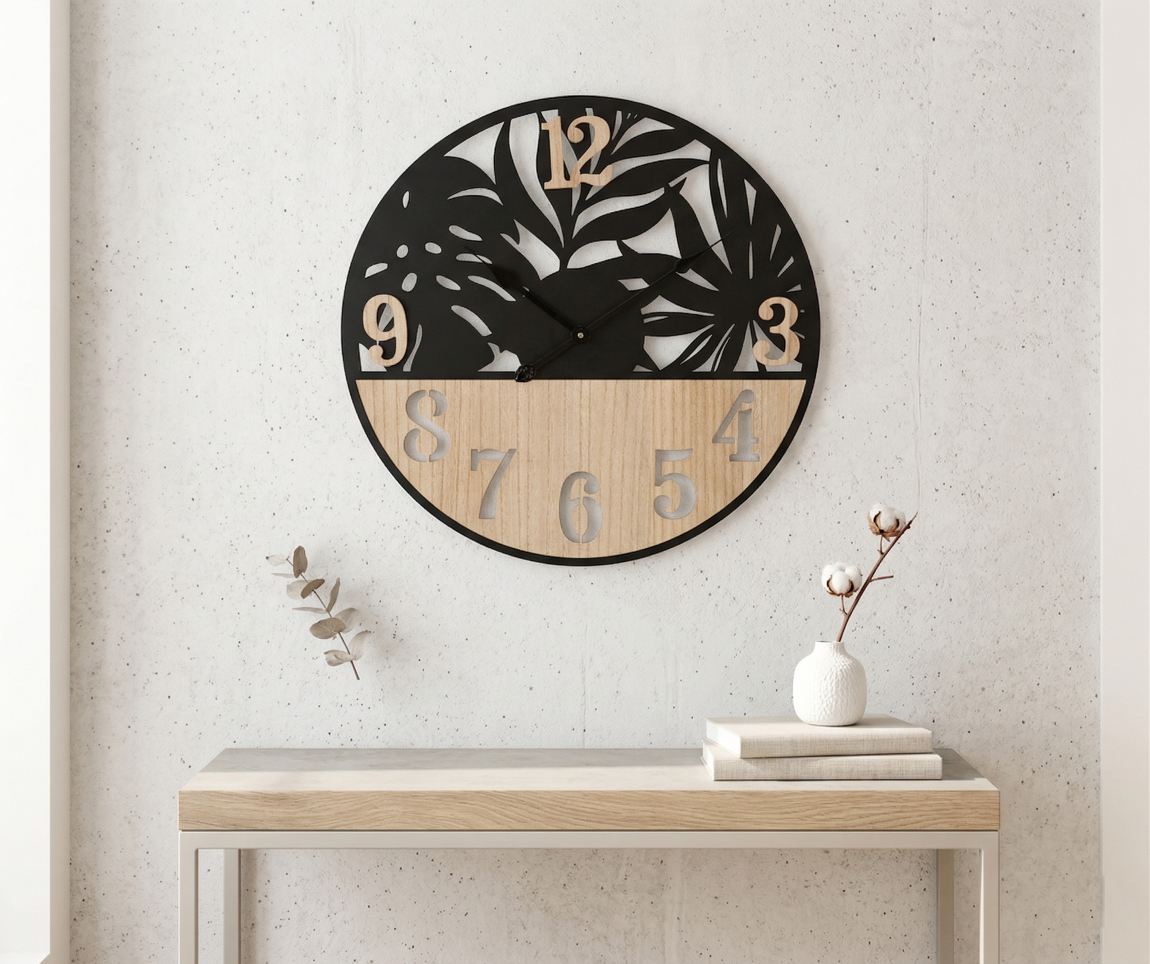 Kella rauast raam tagab tugevuse ja vastupidavuse ning pakub ka esteetilist naudingut. Kella sihverplaat on valmistatud mdf-ist, mille loomulik tekstuur ja soe toon toovad ruumi soojust ja hubasust. Kellaosutid on musta tooni, mis loob visuaalselt köitva efekti.