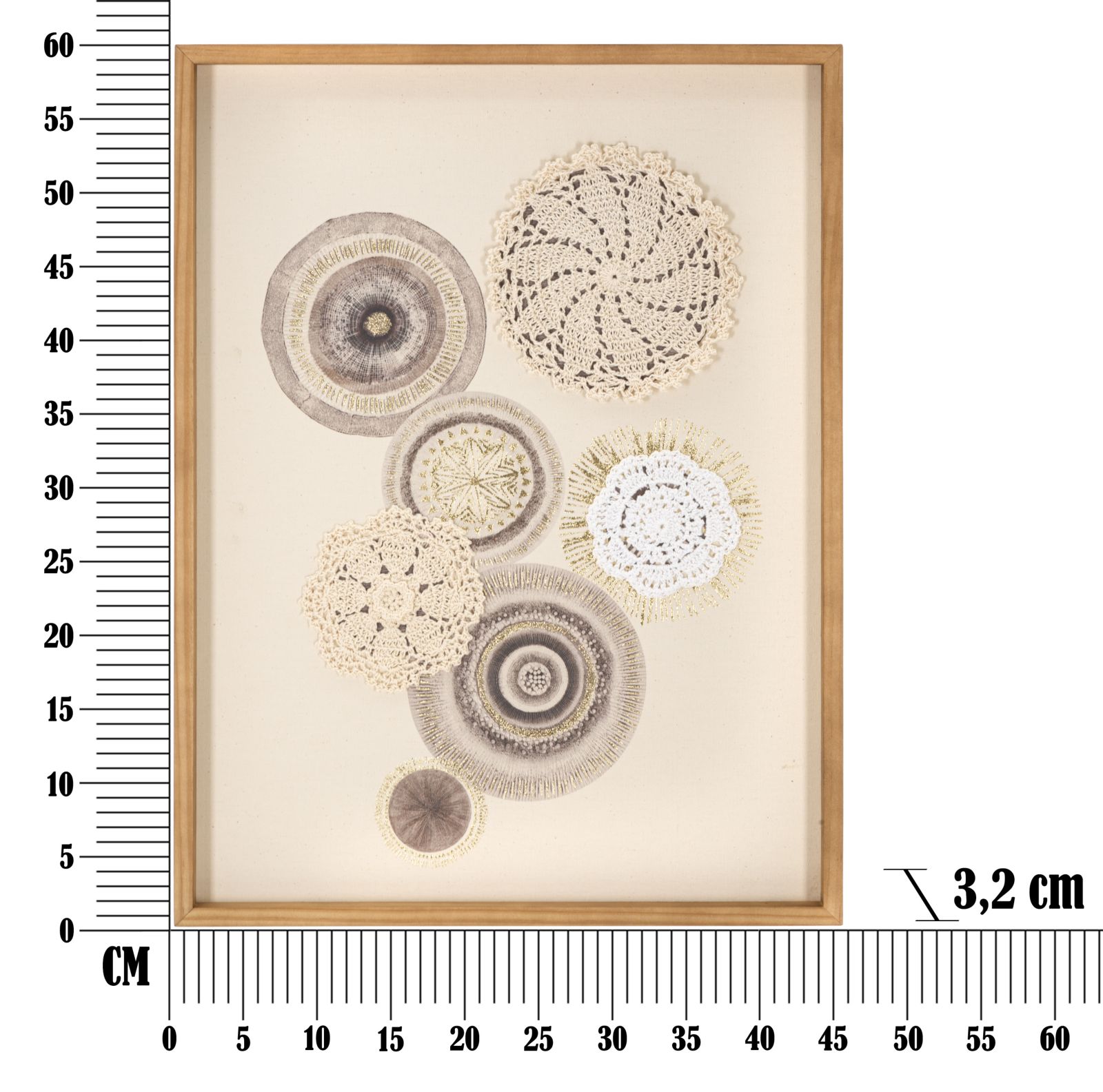 Pildil on stiilsed heegeldatud detailid, mis lisavad omapära ja sügavust. Raam on puidust, mis toob ruumi soojust ja naturaalset puudutust.
