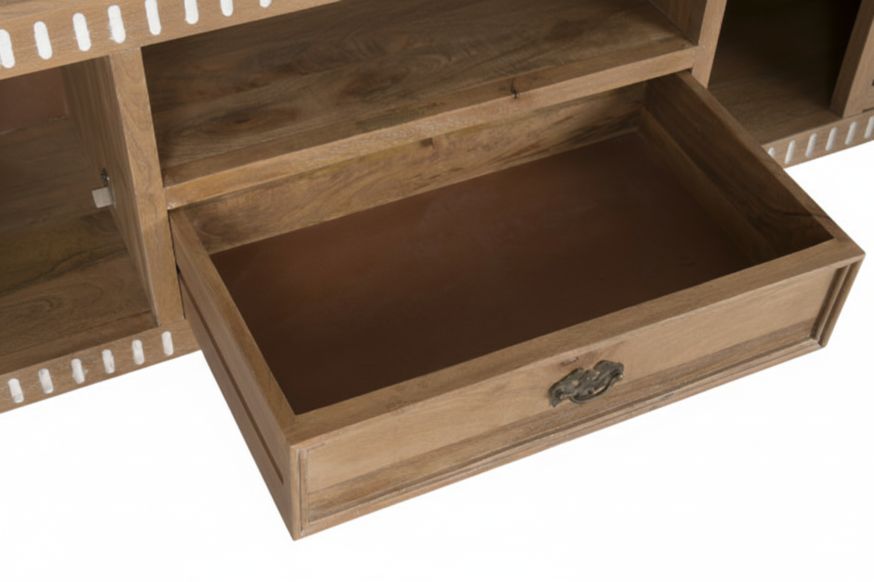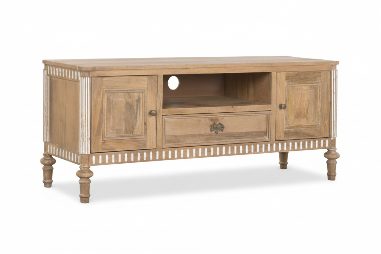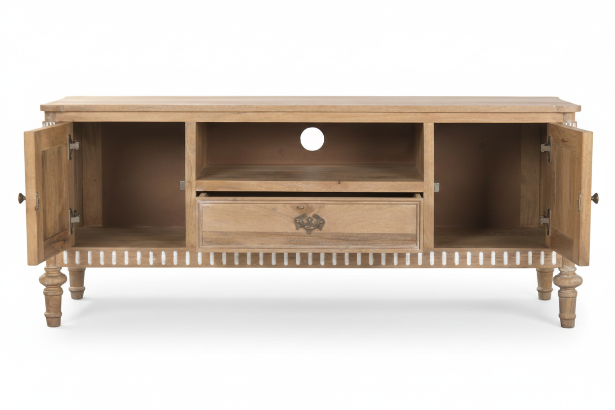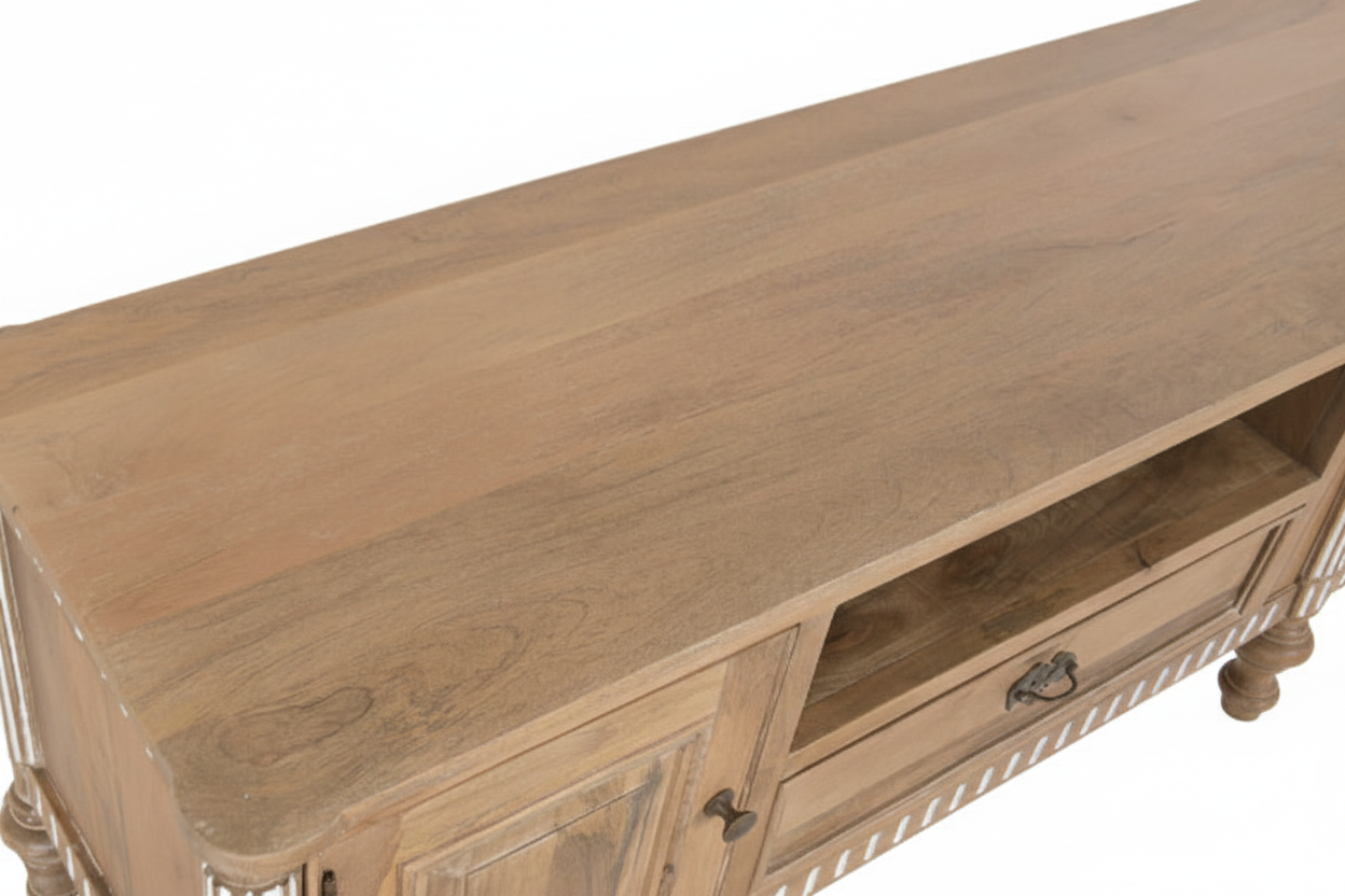 Tv-alus Castillo ühendab endas nii modernsust ja romantilist disaini, sobitudes sujuvalt igasse interjööri. Telerialus on valmistatud mangopuidust, mis on tuntud oma vastupidavuse ja pikaealisuse poolest. See tagab, et tv-alus pole mitte ainult visuaalselt kaunis, vaid ka praktiline investeering teie koju. Mangopuit on materjal, mis aja möödudes muutub kaunimaks, muutes kummuti aastate pärast veelgi iseloomulikumaks ja köitvamaks.