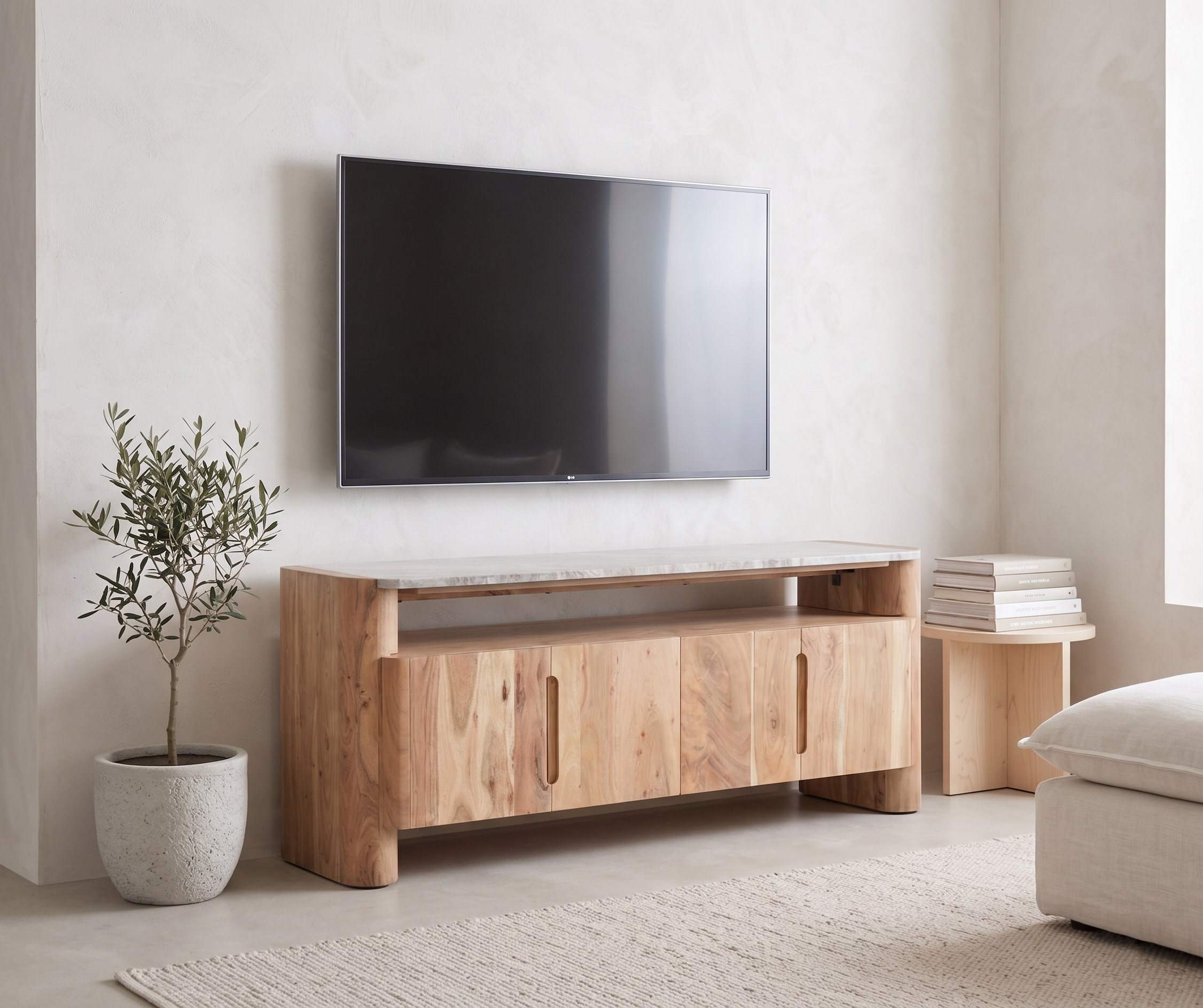 Tv-aluse valmistamisel kasutatud akaatsiapuit on tuntud oma tiheduse ja vastupidavuse poolest. Puit on ka keskkonnasõbralik valik, kuna see on taastuv ja jätkusuutlik. Telerialuse pind on viimistletud naturaalse puidutooniga, mis toob esile puidu loomuliku ilu ja tekstuuri, luues sooja ja kutsuva atmosfääri.